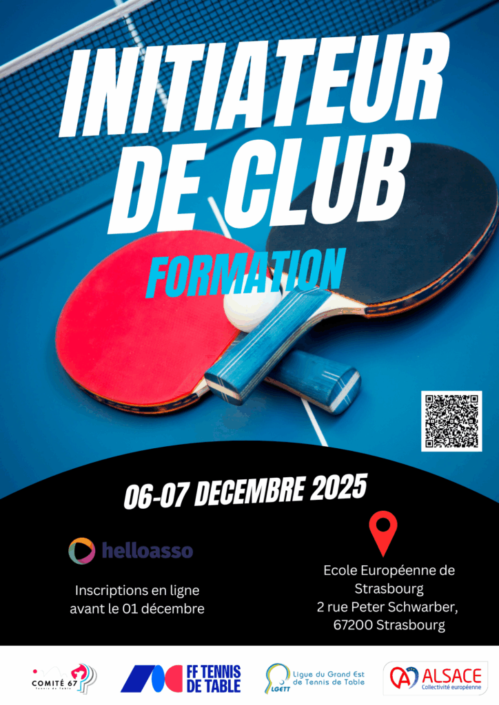 La prochaine session de formation IC se tiendra à l’Ecole Européenne de Strasbourg le samedi 06 et dimanche 07 décembre 2025, de 9h à 17h. Cette formation permettra aux bénévoles des clubs de tennis de table d’acquérir les compétences nécessaires pour encadrer et animer leur association de manière efficace.