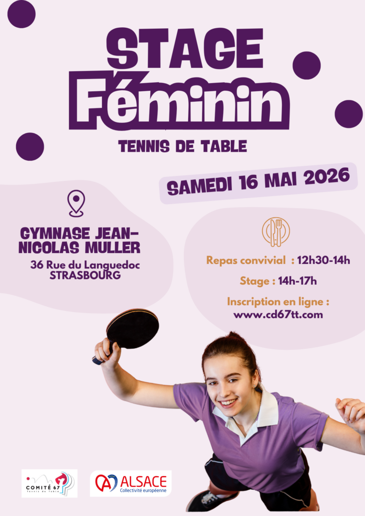Le Comité Départemental de Tennis de Table du Bas-Rhin (CD67TT) a le plaisir de proposer un stage féminin le samedi 16 mai 2026 à Strasbourg.